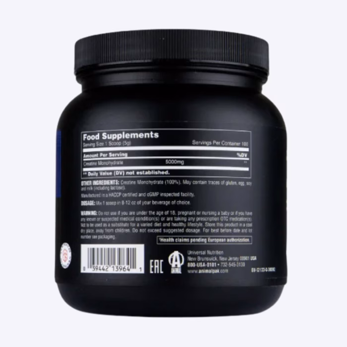 Animal 100% Kreatin Monohidrat ima ključnu ulogu u povećanju mišićne mase, podršci oporavku i unaprjeđenju fizičkih sposobnosti. Brzo se apsorbuje, lako se vari i formulisan je da podrži vaše tijelo i mentalnu oštrinu, kako u teretani tako i izvan nje. Kreatin je jedan od najistraživanijih suplemenata, sa dokazanim efektima na povećanje snage, izdržljivosti i proizvodnje ATP-a – što vam pomaže da ostvarite ciljeve u fitnesu. Ovaj dodatak također može doprinijeti boljem zdravlju mozga, poboljšanoj koncentraciji i smanjenju mentalnog umora.