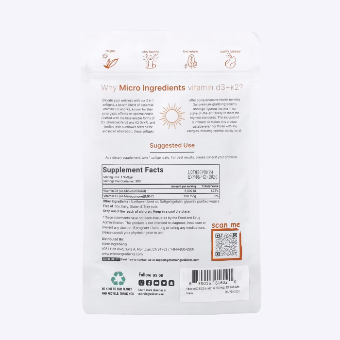 Micro Ingredients Vitamin D3 + K2 je premium dodatak prehrani formuliran tako da kombinira najkorisniji oblik vitamina D3 u visokoj dozi s oblikom vitamina K2 MK-7 – koji je najbiološki aktivniji i najbolje iskorištiv u tijelu. Ova sinergijska formula podržava jak imunitet, zdravlje kostiju i normalnu funkciju srca, te optimizira metabolizam kalcija u tijelu na pravilan način.