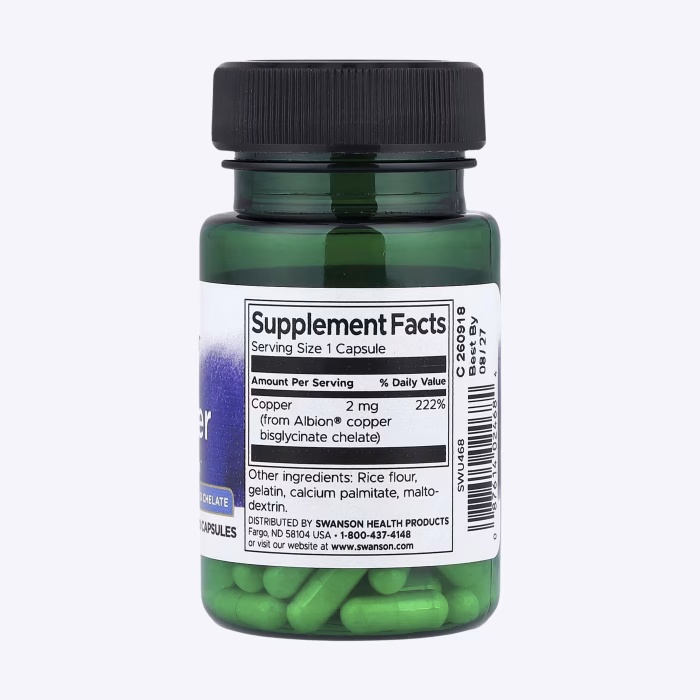 Swanson Albion Copper 2mg ,ovaj dodatak prehrani sadrži 2 mg bakra u formi Albion® kelata po kapsuli, osiguravajući vrhunsku bioraspoloživost. Idealna podrška za zdrav imunološki sistem, metabolizam željeza i zaštitu ćelija od oksidativnog stresa.