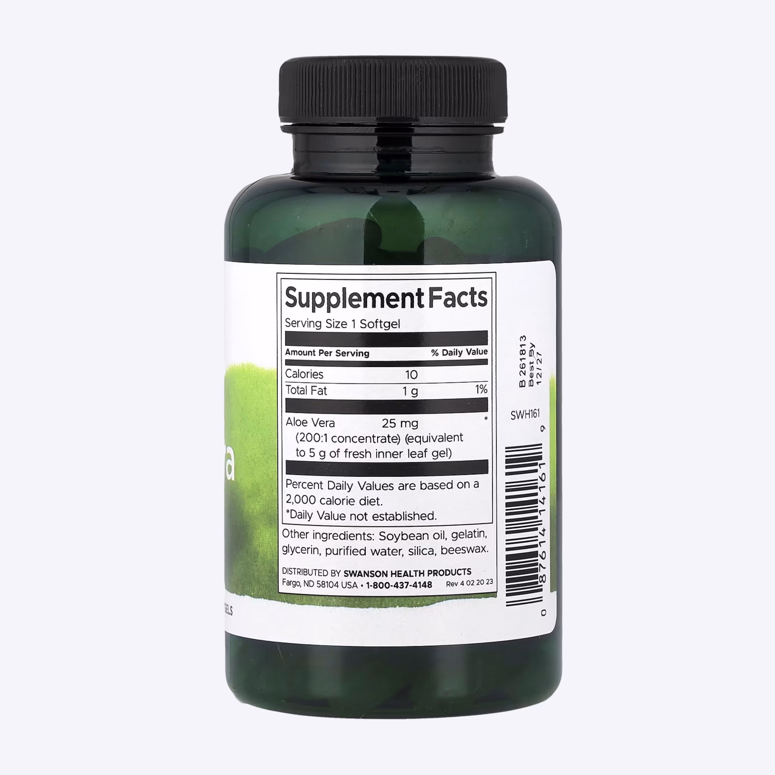 Swanson Aloe Vera sadrži 25 mg koncentrata aloe vere po kapsuli u omjeru 200:1, što znači da svaka kapsula odgovara količini od približno 5 g svježeg gela iz unutrašnjeg lista biljke.