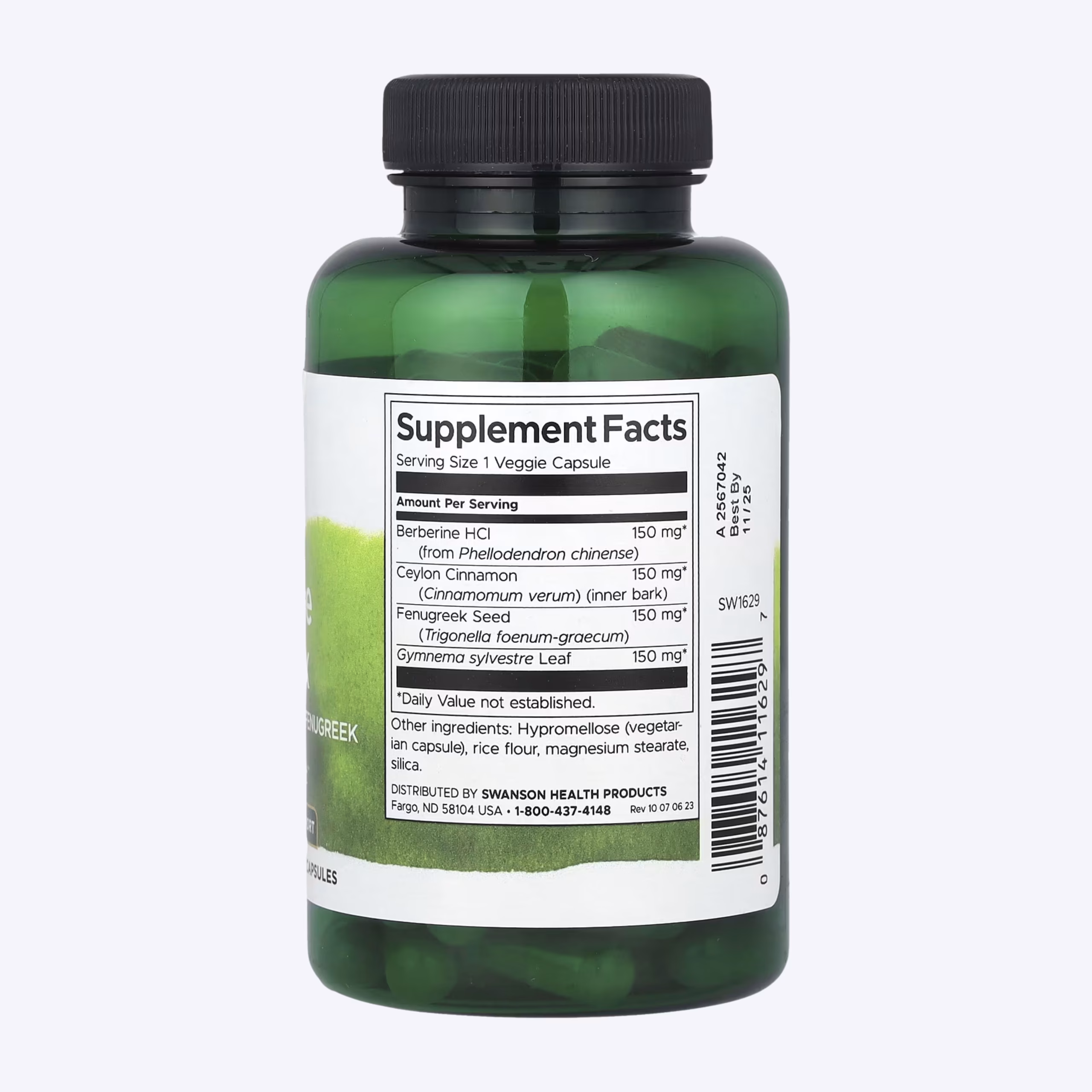 Swanson Berberine Complex kombinuje 400 mg čistog berberin HCl ekstrakta u svakoj kapsuli sa dodatnim biljnim sastojcima: pravi cejlonski cimet, Gymnema sylvestre (srebrna svilenica) i piskavica. Ova sinergijska kombinacija pruža podršku u održavanju ravnoteže šećera u krvi, masnoća i općem kardiovaskularnom zdravlju.