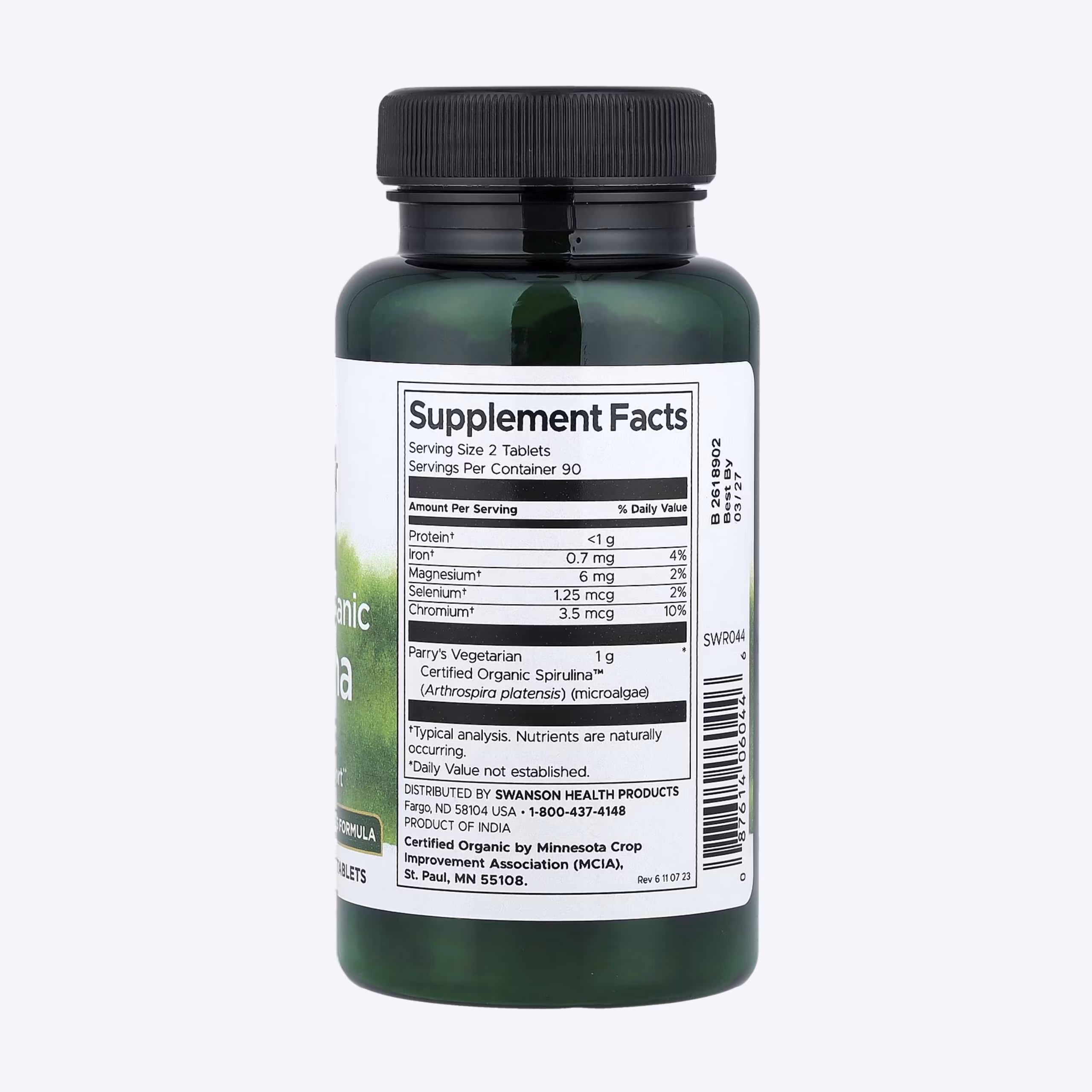 Swanson Certified Organic Spirulina, Svaka tableta sadrži koncentrirani prah spiruline, visokovrijedne mikroalge bogate proteinima, vitaminima, mineralima i antioksidansima.