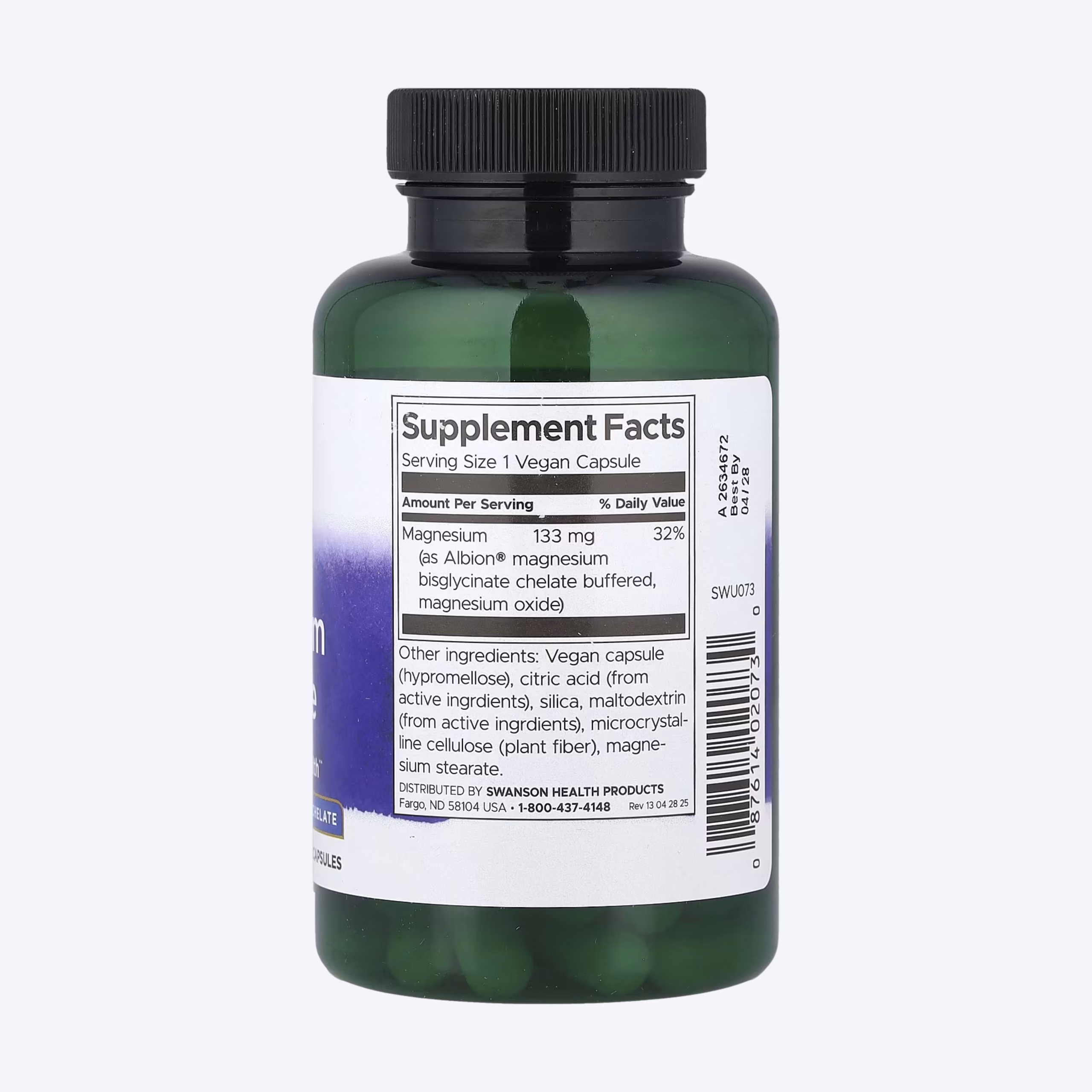 Swanson je na tržištu od 1969. godine i poznat je po pouzdanim formulama i kvalitetnim mineralima.Ovaj proizvod koristi Albion® TRAACS® Swanson magnesium bisglycinate chelate, jedan od najkvalitetnijih oblika magnezija, vezan za aminokiselinu glicin radi bolje apsorpcije i blažeg djelovanja na želudac.