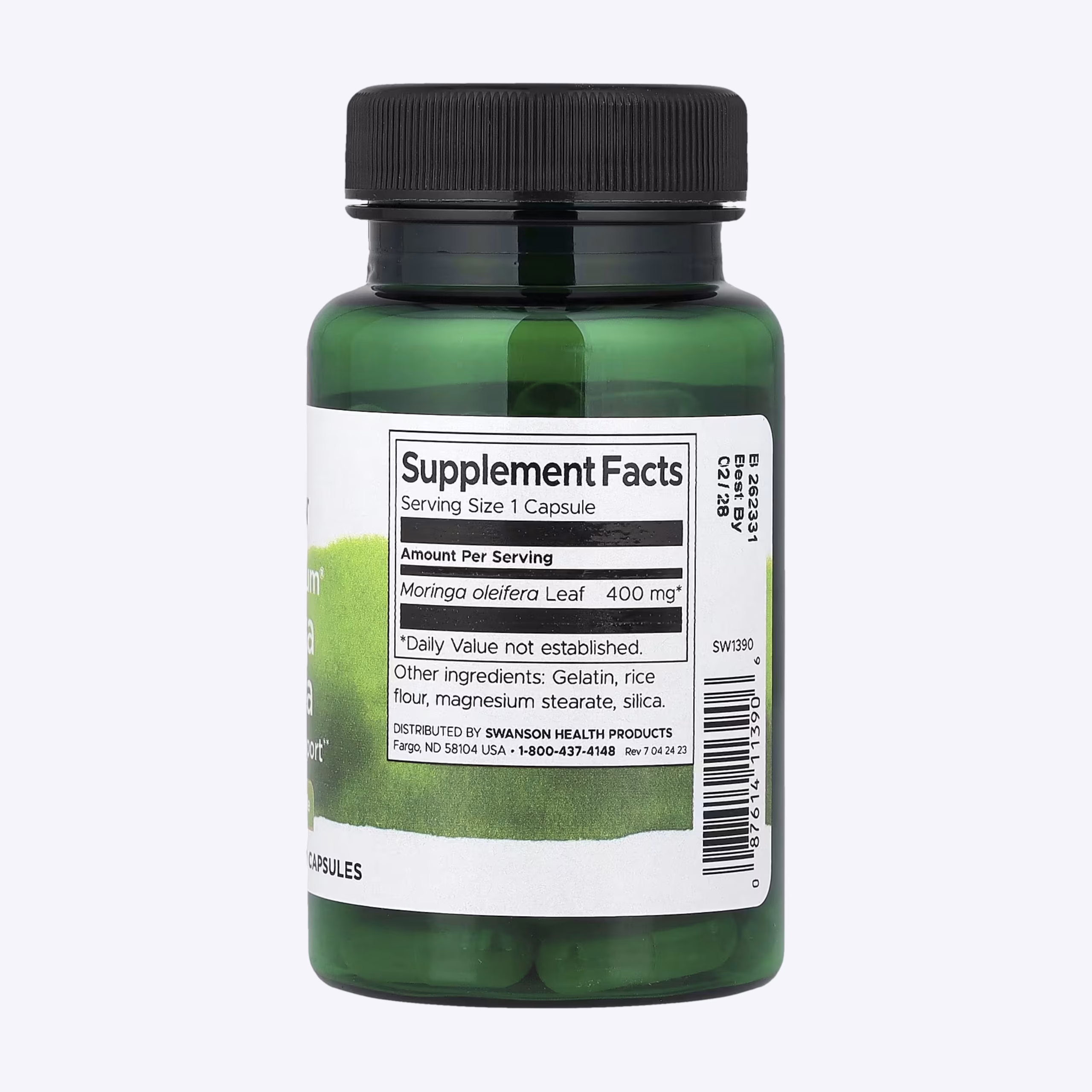 Swanson Moringa Oleifera 400mg, svaka kapsula sadrži 400 mg punog spektra praha lista Moringa oleifera — biljke poznate kao “čudotvorno stablo”, bogate vitaminima, mineralima, aminokiselinama i antioksidansima.