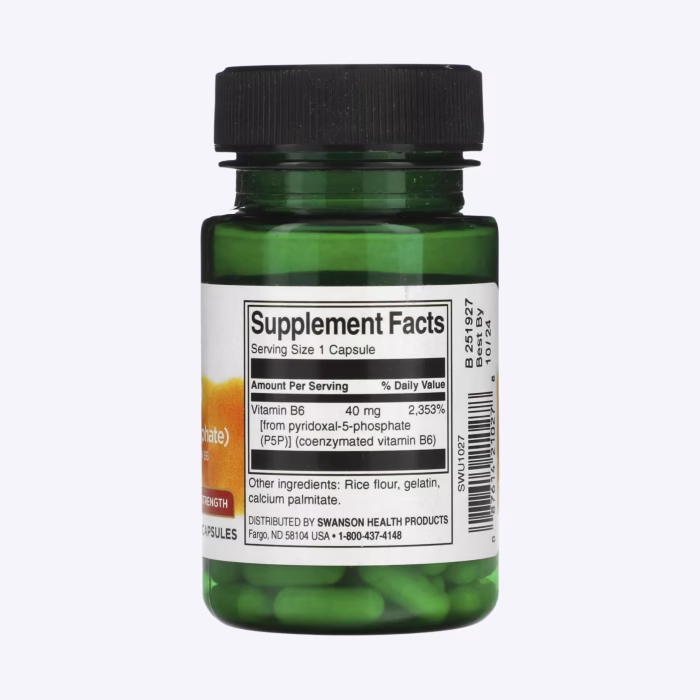 Swanson P-5-P Coenzymated Vitamin B6 je dodatak prehrani američkog brenda Swanson, koji je prisutan na tržištu dodataka prehrani od 1969. godine i poznat je po kvalitetnim formulama, kontroli sastojaka i pouzdanim suplementima.Ovaj proizvod sadrži Pyridoxal-5-Phosphate (P5P), aktivni koenzimski oblik vitamina B6.