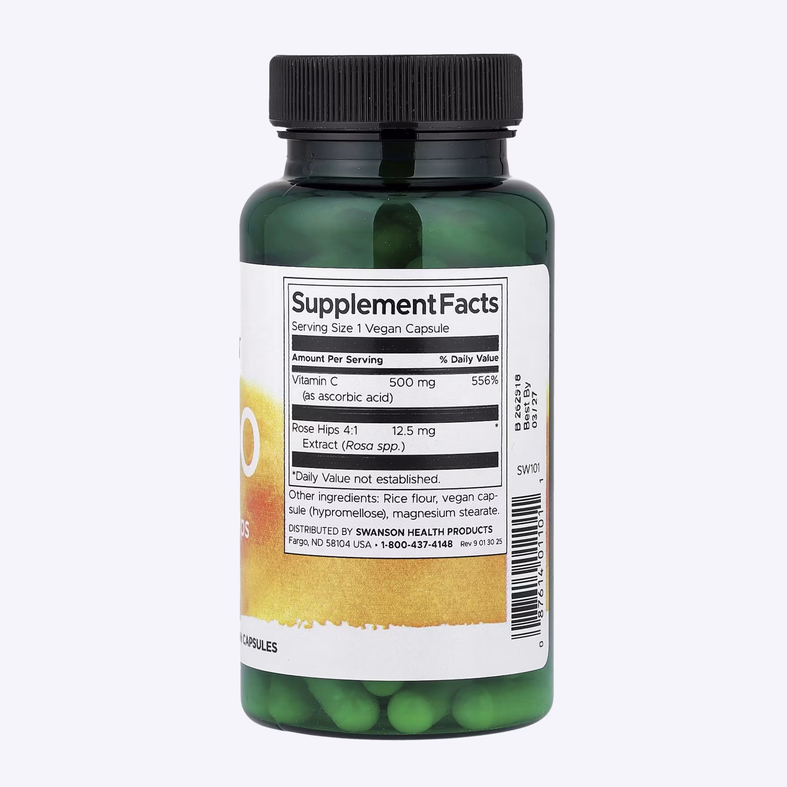 Swanson Vitamin C with Rose Hip je dodatak ishrani koji kombinuje snažnu dozu vitamina C (500mg) s prirodnim ekstraktom šipka (rose hip), biljnim izvorom antioksidansa.