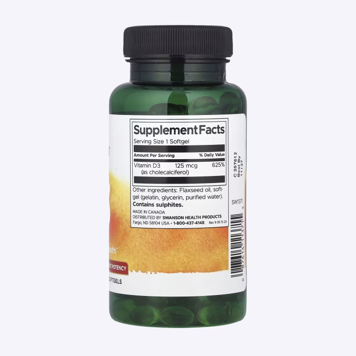 Swanson Vitamin D3 5000IU, svaka kapsula sadrži 5 000 IU (125 µg) vitamina D₃ (kolekalciferol), oblika identičnog onom koji se nastaje u koži pod utjecajem sunčeve svjetlosti.